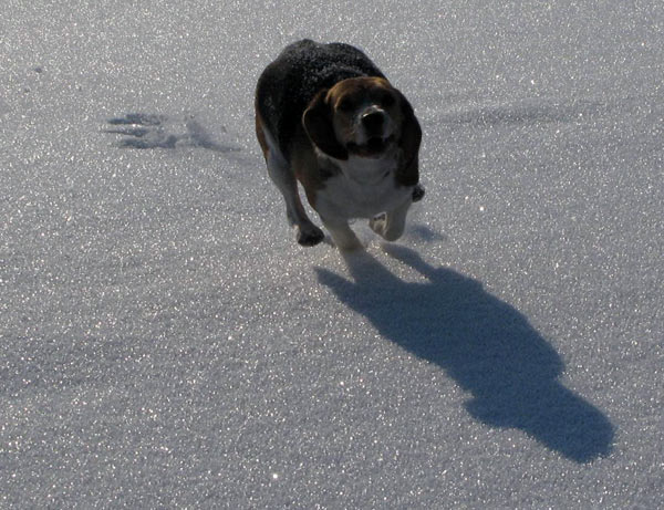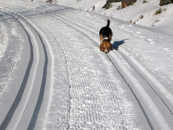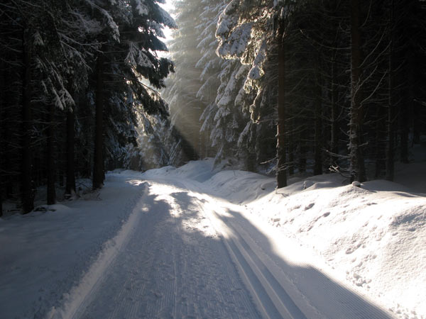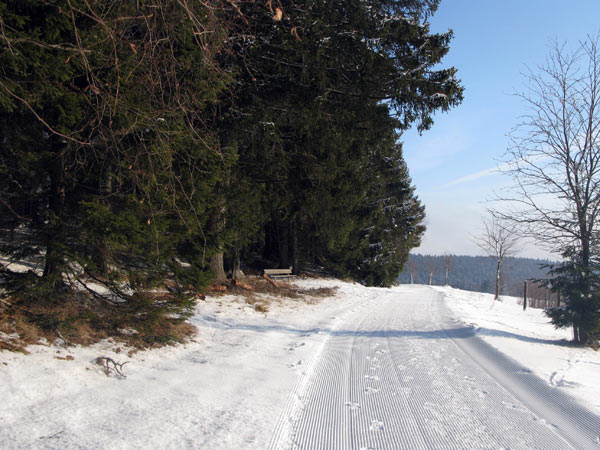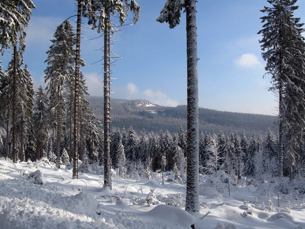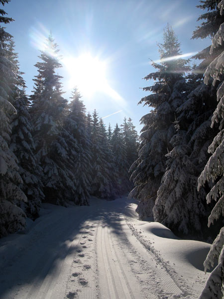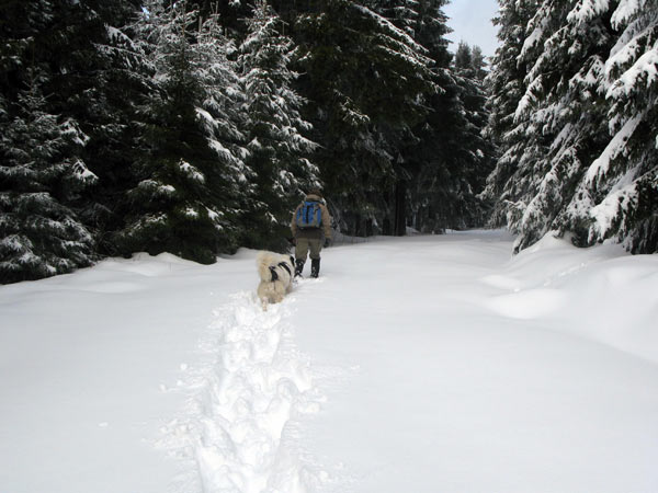 Am nächsten Tag begann der Morgen bereits mit herrlicher, klarer Sicht und Sonnenschein. Wir fuhren nach einem ausgiebigen Frühstück zum Königskrug, stellten dort das Auto ab und machten uns auf dem Weg zum Wurmberg. Inzwischen, es war ja Sonntag, waren die Wege stark frequentiert. Der Aufstieg zum Wurmberg war dann teilweise etwas anstrengend, da viele Wege für die Skifahrer als Piste genutzt wurden und wir zum Teil direkt unter dem Lift steil nach oben laufen mussten bis wir einen Weg, welcher noch nicht begangen wurde fanden und wir uns durch Neuschnee kämpften. Interessant war das Verhalten der Hunde, welche schnell merkten, dass es doch einfacher ist in der Spur meines Bruders zu laufen, welcher mit Schneeschuhen vorneweg lief, als im Schnee herumzualbern. Ich bildete die Nachhut und behielt das ganze Geschehen im Auge.