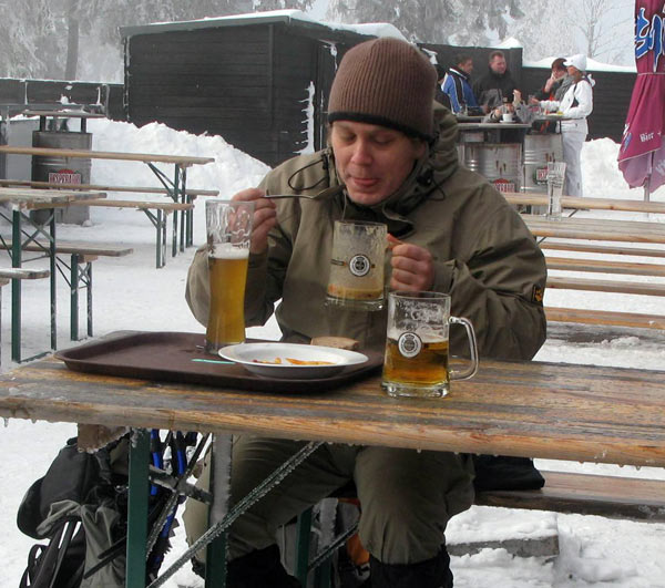Auf dem Wurmberg angekommen, gönnten wir uns wieder unsere obligatorische Mahlzeit und betrachteten das Treiben der anderen Besucher der Wurmbergbaude. Nachdem wir und die Hunde gestärkt waren, machten wir uns auf dem Weg nach Braunlage und von dort aus weiter zum Königskrug, wo wie mit Einbruch der Dämmerung ankamen. Insgesamt waren es an diesem Tag ca. 20 km. Unterwegs war dann bei den Hunden doch teilweise recht gut zu erkennen , dass Arco und Bonsai die bessere Kondition besitzen als Anka, weil ich mit den beiden regelmäßig jogge, inzwischen über 10 km, wohin gegen Anka erst zwischen 5 und 8 km mitläuft. Es bringt Hunden also sehr viel, wenn auch diese konditionell aufgebaut werden, nicht nur Herrchen oder Frauchen. Ebenfalls wurden wir bestimmt 200 mal oder mehr mit den obligatorischen Sprüchen begrüßt: