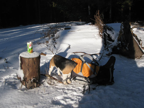 Auf dem Brocken angekommen, gönnten wir uns eine Mahlzeit im Schnee bevor wir uns aufmachten weiterzuwandern. Unterwegs war dann immer noch Zeit und Gelegenheit mit den Hunden in dem 50 bis 60 cm tiefen Neuschnee zu spielen bzw. des Öfteren mal die Aussicht zu genießen, wenn die Wolken dies zuließen. Mit Einbruch der Dämmerung ereichten wir den Campingplatz, wo wir den komfortablen neu ausgestatteten Sanitärbereich mit ausgiebigen Duschen nutzen und genossen den verbleibenden Abend und planten den nächsten Tag. Insgesamt haben wir ca. 15 km zurückgelegt, welche uns und die Hunde bedingt durch den Neuschnee doch gut gefordert haben.